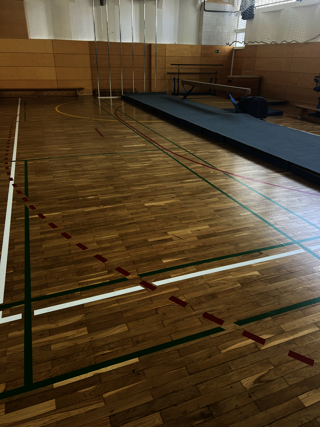 - Turnhallenboden (Parkett) in mehreren Schleifgängen abschleifen, grundieren und